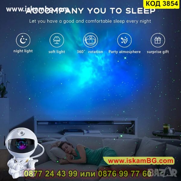 Чрез своите движения и цветове прожектора астронавт осигурява приятна среда, помагаща за облекчаване на безпокойството и подобряване на качеството на съня.