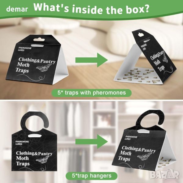 Тези феромонови капани за молци са проектирани за ефективно привличане и улавяне на молци от килими с помощта на синтетични полови феромони, идеални за насочване към мъжки молци. Проектирани за универсално поставяне, тези капани могат да се поставят в края на стаята, като се избягват директни въздушни течения, или да се пъхнат под мебели за дискретна употреба. Те могат да бъдат подредени плоски или окачени, като се адаптират към различни настройки, включително гардероби. Без мирис, нетоксични и без пестициди, тези капани гарантират безопасност както за семейството, така и за домашните любимци. Въпреки че осигуряват дълъг експлоатационен живот, упоритите зарази може да изискват допълнителни методи като топки от молец или професионален контрол на вредителите за оптимални резултати.