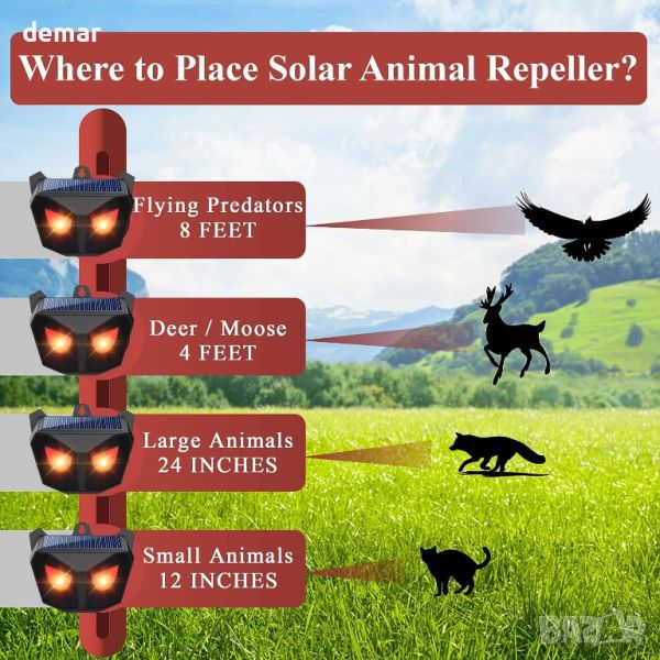Това захранвано със слънчева енергия средство за възпиране на животни предлага ефективно и хуманно решение да държите нощните хищници като скунксове, елени, лисици, вълци, койоти, зайци, миещи мечки и птици далеч от вашата градина. Устройството разполага с вградена акумулаторна батерия, която се зарежда напълно от слънчева светлина и използва червени LED светлини, които мигат през нощта, за да имитират охранителни камери или трептящи пламъци, възпиращи нежеланите диви животни. Светлините се активират автоматично при здрач и се изключват на зазоряване, осигурявайки енергийно ефективна работа през цялата нощ. За оптимална работа устройството трябва да се инсталира на място с пряка слънчева светлина, за да се увеличи максимално зареждането. Лесно се настройва и използва - просто включете устройството и го монтирайте на стълб, ограда или стена с височина между 1 и 8 фута, съобразена с нивото на очите на целевите хищници. Този метод избягва използването на вредни химикали, отрови или капани, осигурявайки безопасна и екологична алтернатива за защита на вашето имущество.