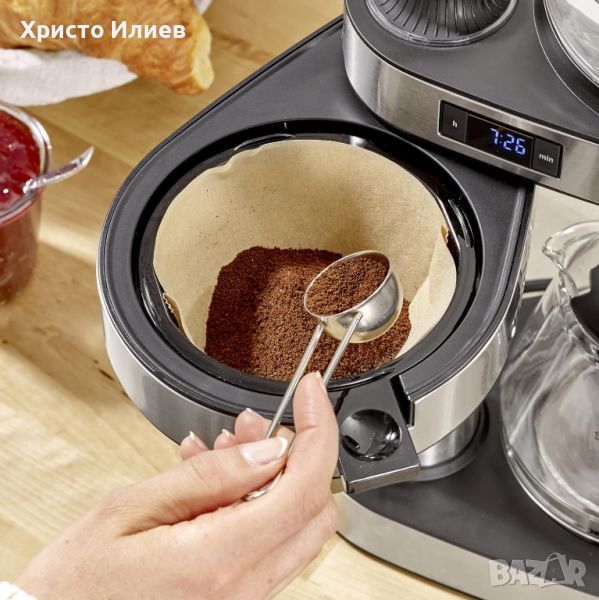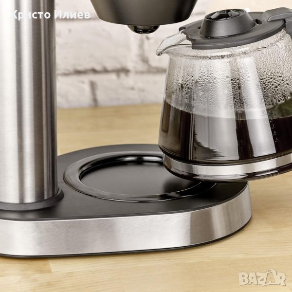 Работи без проблеми. Няма никакви забележки . Има приложени реални снимки. Точно като ръчно приготвено кафе благодарение на иновативния процес на приготвяне, плътно, ароматно и мощно.Идеална температура на приготвяне благодарение на иновативната технология Thermotronic (92 - 96°C) за перфектно и горещо удоволствие от кафето.LED дисплей с функция таймер за активиране на процеса на варене, допълнителна функция за отстраняване на накип.Индивидуално удоволствие от кафето благодарение на два избираеми профила на приготвяне: 1. За меко, балансирано удоволствие от кафе 2. За наслада от силно, плътно кафе според стандартите на ECBC.Фин аромат, интензивен цвят, омайващ аромат - С филтърната кафеварка Caprice KA 5760 със стъклена кана от SEVERIN можете да приготвите няколко чаши вкусно кафе за цялото семейство с натискането на един бутон.Благодарение на иновативния процес на приготвяне можете да се насладите на кафето като нежно приготвено на ръка. Красивото нещо: Благодарение на прозрачния стъклен съд за вода, имате един поглед върху процеса на варене. Със своя елегантен дизайн от неръждаема стомана с черни пластмасови елементи, кафе машината е и удоволствие за очите.2 профила за приготвяне на кафе по ваш вкусНезависимо дали е меко и балансирано или силно и плътно според стандарта ECBC, с Caprice можете да приготвите кафе по ваш вкус.ECBC означава критериите за качество оптимално време и температура на варене, равномерно извличане на аромата и идеален баланс на количество вода и кафе на прах.Стилен и практиченПълненето на кафето на прах е много удобно: Отделението на филтъра за кафе може лесно да се отвори и напълни отпред.Въртящият се филтър има и практична капачка за оттичане.Температура в точкатаИнтегрираната технология Thermotronic осигурява идеалната температура на варене от 92-96 °C и пълен аромат на кафе.Прозрачният стъклен резервоар за вода е оборудван с везна за 8 големи или 12 малки чаши. Така че гарантирано ще напълните подходящото количество вода за процеса на варене.Кафе в желано от вас времеИскате да станете сутрин и кафето да е вече свежо и уханно? Няма проблем за Caprice. Благодарение на LED дисплея с интегрирана функция за таймер, можете да настроите предварително началото на процеса на варене според вашите желания.Запазва кафето ви горещо за дълго времеНасладете се на уютна закуска и кафе: Интегрираната функция за затопляне поддържа вашето филтърно кафе горещо и вкусно до 35 минути.Лесен за почистванеЗа да можете да се насладите на кафето си дори след петата кана с пълен аромат, Caprice е оборудван с функция за отстраняване на котлен камък.Стъклената кана може лесно да се почиства в съдомиялна машина.