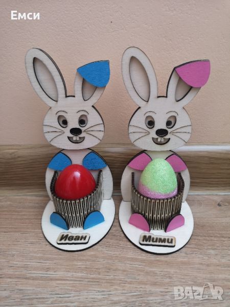 Два размера Великденски зайчета с възможност за гравиране името на детето. Дървен материал.-По- малките за Великденско яйце- 8 лв за бр с гравирано име и 7 лв без име- По- големите за яйце и лакомства за децата - 12 лв с гравирано име и 11 лв без име.