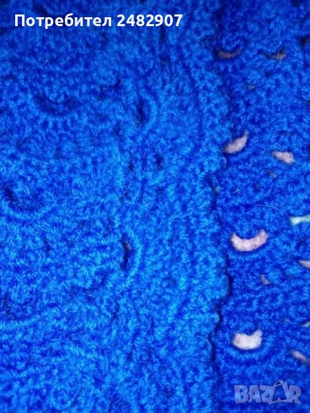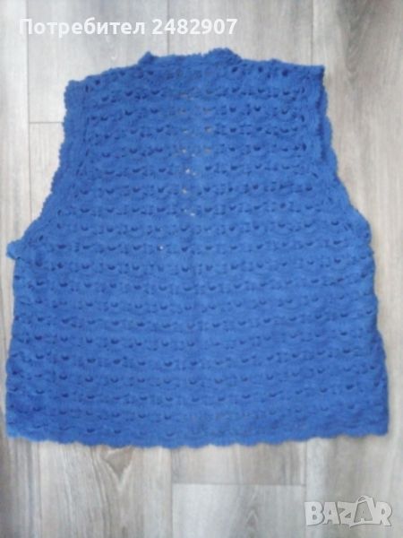 Тъмно син дамски елек, ръчно изплетен на една кука, размер М. Ширина в раменете - 34 см, ширина под мишниците - 50 см, ширина в долната част - 59 см, дължина от рамото до долу - 51 см. Много запазен, почти не е използван, закопчаване - с три броя скрити телени копчета.