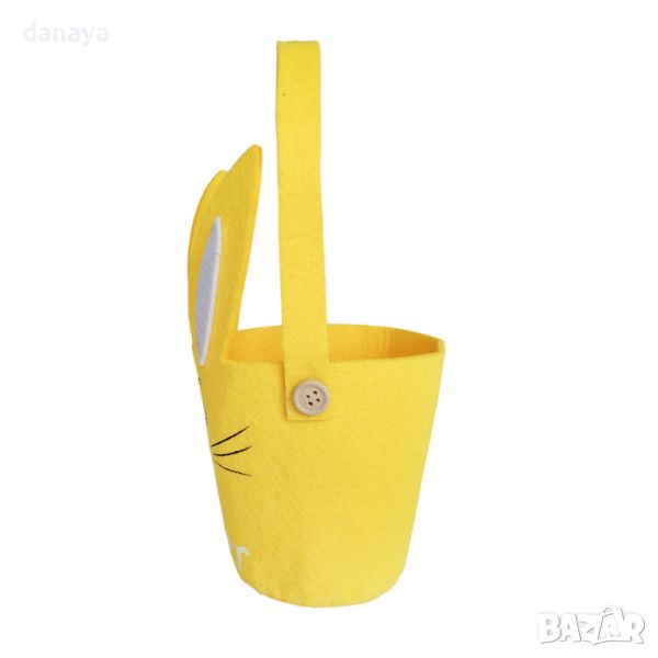 Малка великденска кошничка с лице на весело зайче. Кошничката е с дръжка и е подходяща за великденски яйца и лакомства. Ярки пролетни цветове! Изработена от филц. Чудесна украса и декорация за Великден! Кошничката може да събере до 5-6 яйца.