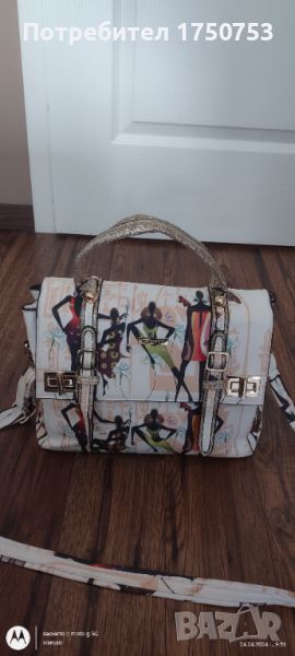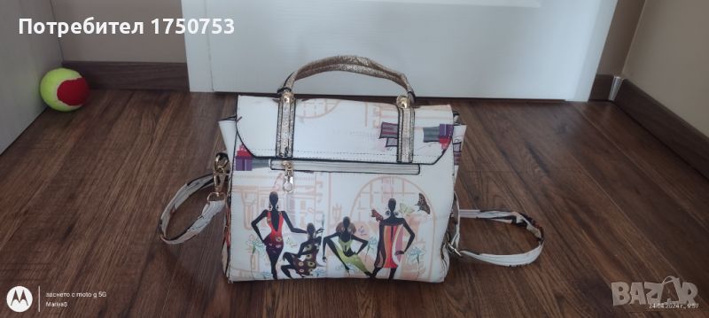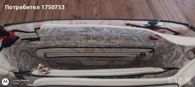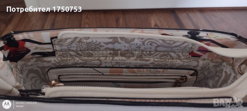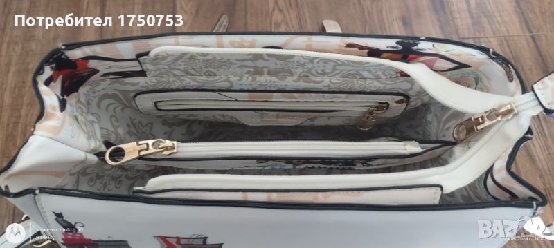 Дамска чанта от еко кожа с принт на VERA MAY. Размери:ширина 27 см; височина 23 см. Много добре запазена. Има удобни вътрешни прегради и вътрешни джобове с цип. Чантата е с красива вътрешна подплата на цветя.