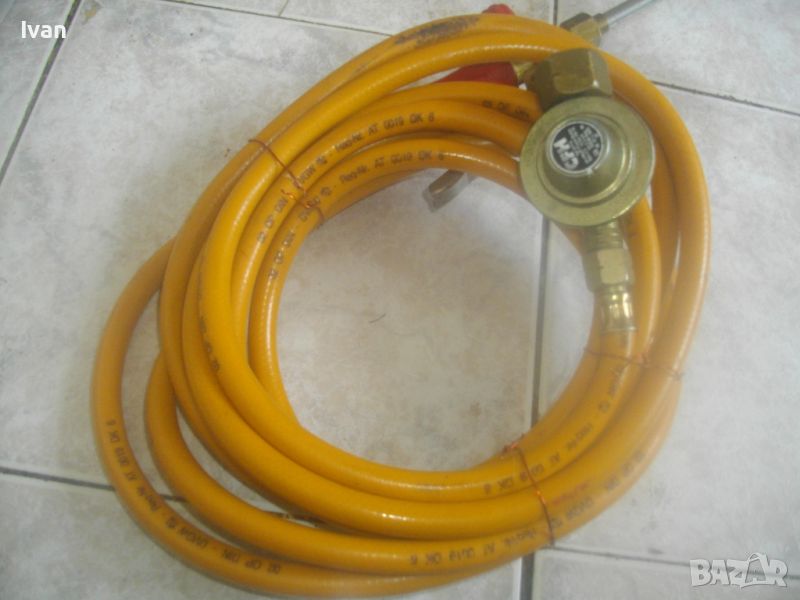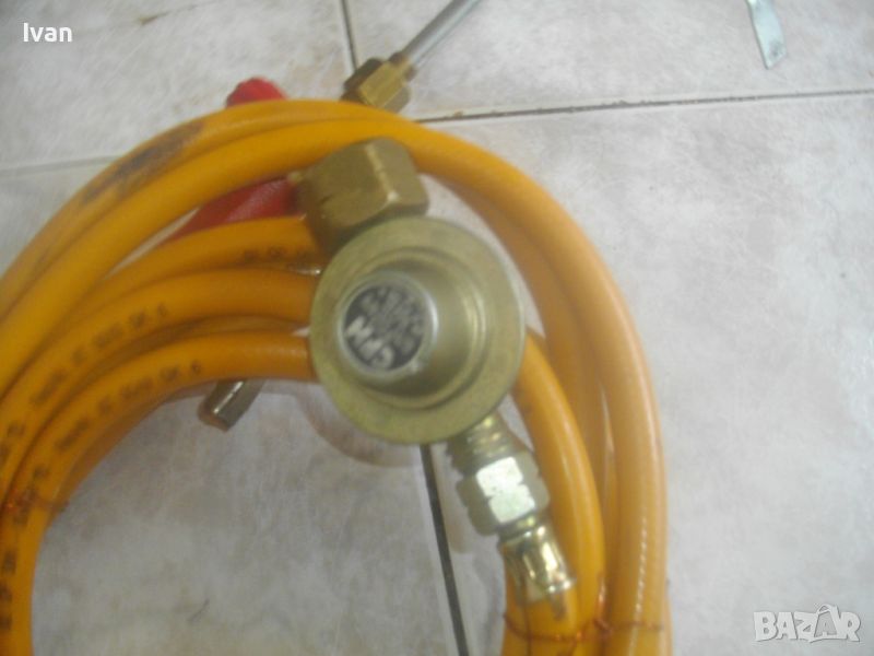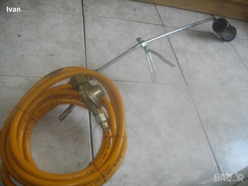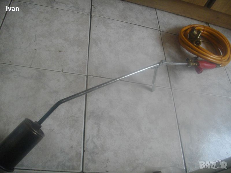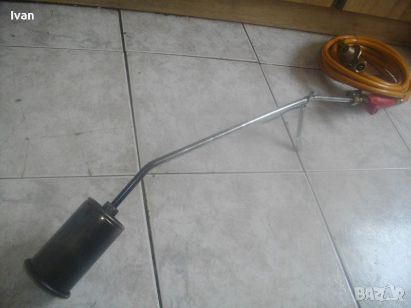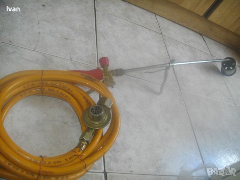 ОПИСАНИЕ на горелка газ пропан.бутан дълга 90 см - за хидроизолации/покриви/ремонтни строителни дейности. Марка CFH. Цена 159 лв. С оригинален маркуч дебел 5 м и оригинален на марката редуцир вентил за налягане. Дължина на горелката - 90 см. Чашка отпред ф 70 мм с 6 дупки за пламъка. Спирателен кран, дълъг метален спусък. Стойка метална на рамото тръба за самостоятелен стоеж. Маркуч стандарт DVGW. Редуцир вентил налягане поставен - оригинален - CFH Typ 52144 - с характеристики: Qn - 6 kg/h. Pa - 2,5 bar. 10 bar, PN 16. bpe - 3,5. Вентила е бронзов. Горелката, маркуча и вентила са почти нови, в отлично визуално и работно състояние.