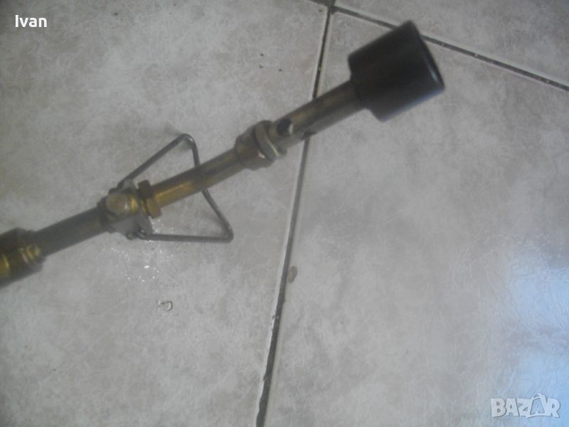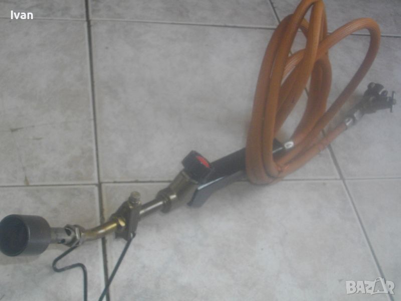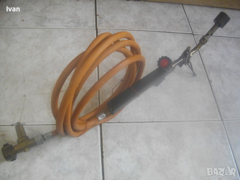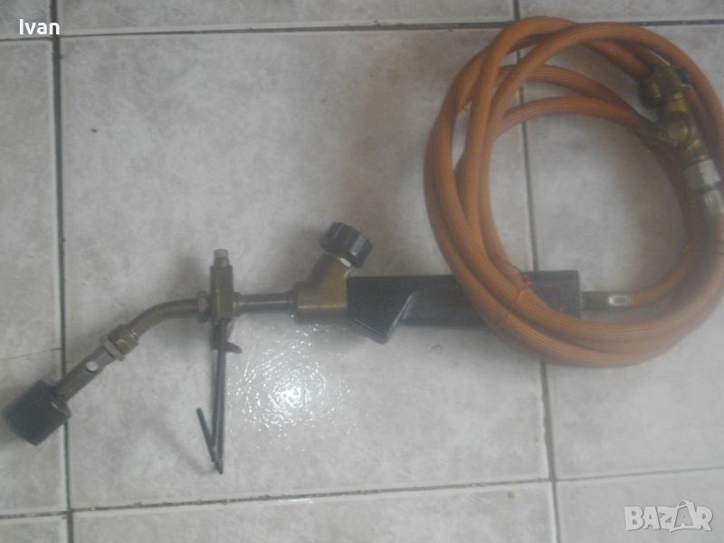 ОПИСАНИЕ на горелка газ пропан.-бутан къса 38 см - немска професионална - старо качество. Цена 199 лв. Марка маркирана - FORON Propn 0,15 Mpa.Почти нова, с оригинален маркуч тънък с дължина 3 м и оригинален голям бронзов вентил със спирателен кран върток. Дължина на горелката - 38 см. Бакелит черна дръжка. Масивна. Глва на горелката - бронзова масивна. Стойка оригинална на главата за самостоятелен стоеж на горелката. Накрайник дюза чашка отпред от дебело плътен бронз диаметър ф 30 мм. Тегло на горелката с маркуча и вентила - 1, 2 кг. Цена - 199 лв.