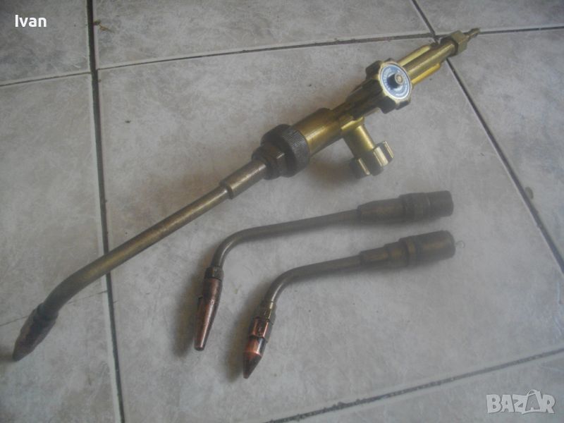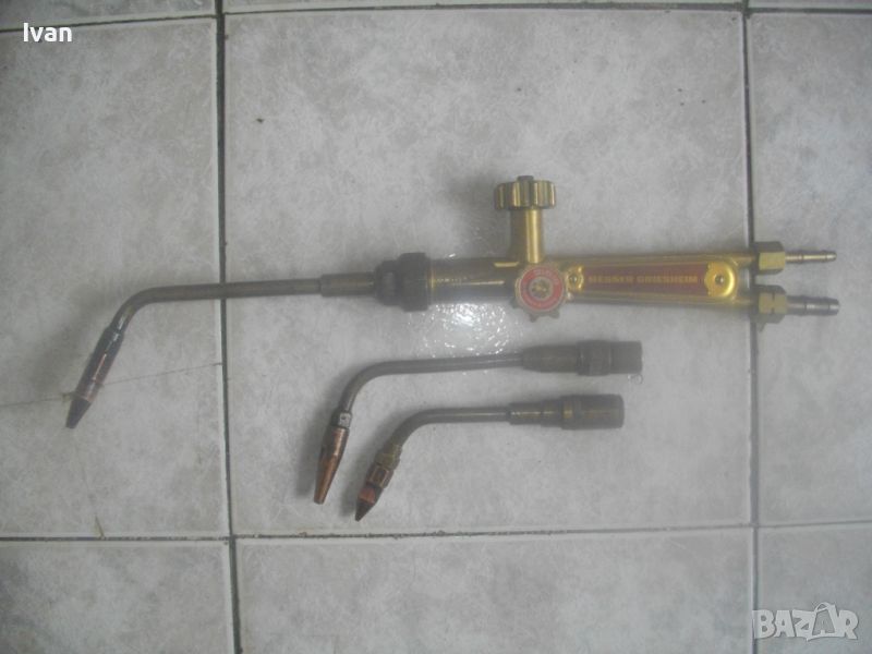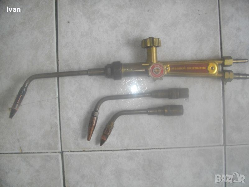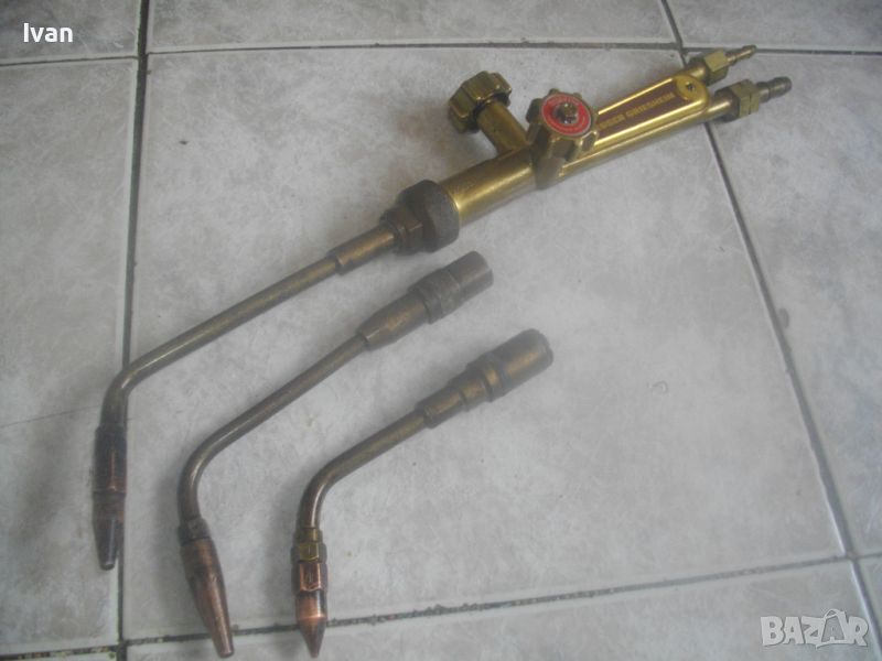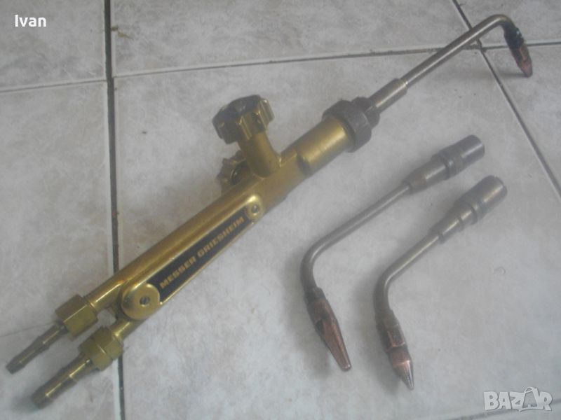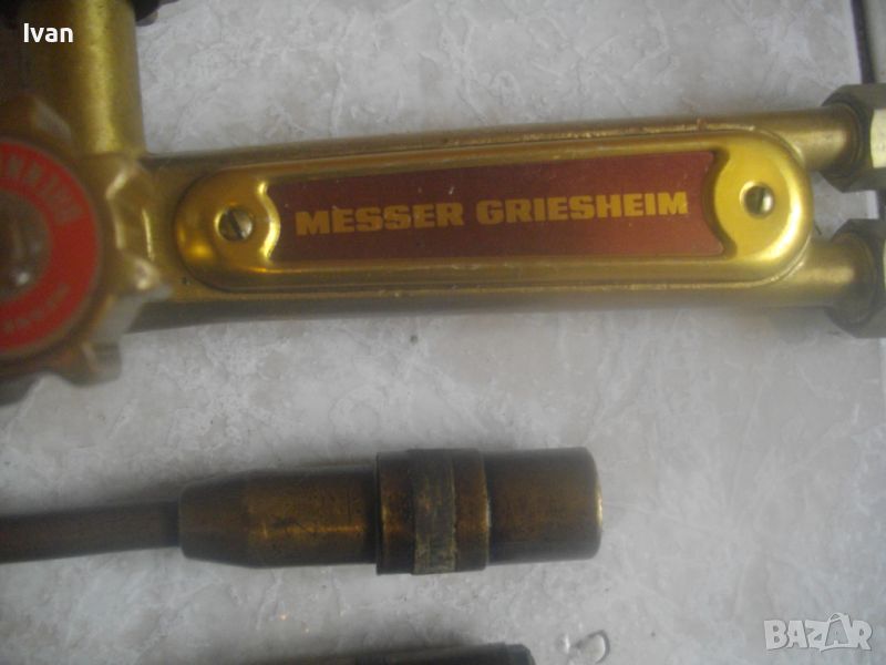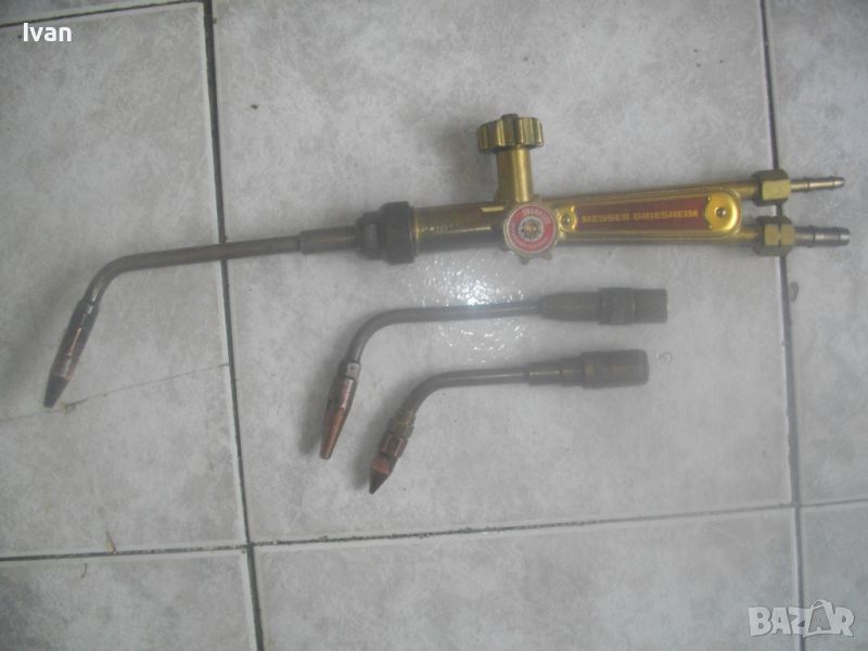 Цена на резак горелка за оксижен газо-кислородно - ацетилен рязане/заваряване/запояване - немски НОВ - професионален Messer Griesheim - 44 см - с едно рамо и 1 дюза - 2 крана - цена 229 лв. Цена на две рамена с контактни дюзи № 1 и № 2 за резак за оксижен, съвместими с горните с марката Messer Griesheim и с други - цена 49 лв/ 1 бр. рамо с кантактна дюза.