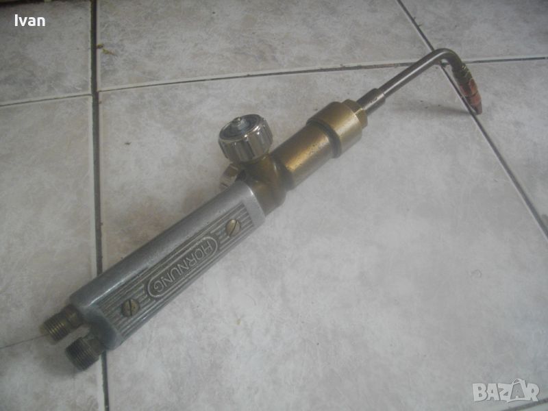 ОПИСАНИЕ на горелка оксиженна с алуминиева дръжка бленер за оксижен /газо-кислородно-ацетииленово рязане заваряване/ - цена 199 лв. Марка HORNING.Старо качество немско професионално производство. Дължина с поставеното рамо - 37 см. 2 спирателни крана. Алуминиева дръжка бленер. с 2 извода за щуцери отзад. Бронзова глава отпред, оригинално на марката поставено бронзово рамо 16 см с оригинална контактна дюза медна № 2. Отлично работно състояние. Тегло на резака - 0,8 кг. Цена - 199 лв.