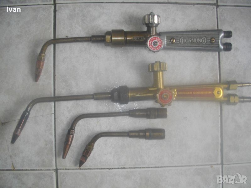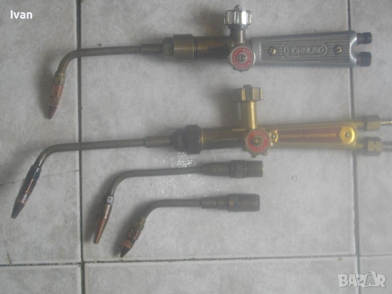ОПИСАНИЕ на резак с алуминиева дръжка бленер за оксижен /газо-кислородно-ацетииленово рязане заваряване/ - цена 199 лв. Марка HORNING.Старо качество немско професионално производство. Дължина с поставеното рамо - 37 см. 2 спирателни крана. Алуминиева дръжка бленер. с 2 извода за щуцери отзад. Бронзова глава отпред, оригинално на марката поставено бронзово рамо 16 см с оригинална контактна дюза медна № 2. Отлично работно състояние. Тегло на резака - 0,8 кг. Цена - 199 лв.