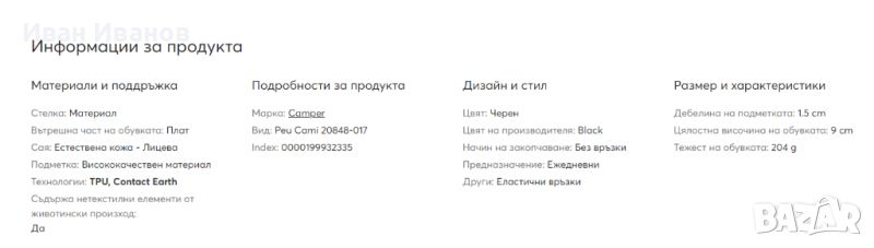 Подплата: 45% текстил (70% бамбукови влакна, 30% рециклиран полиестер), 44% телешка кожа, 11% свинска кожа