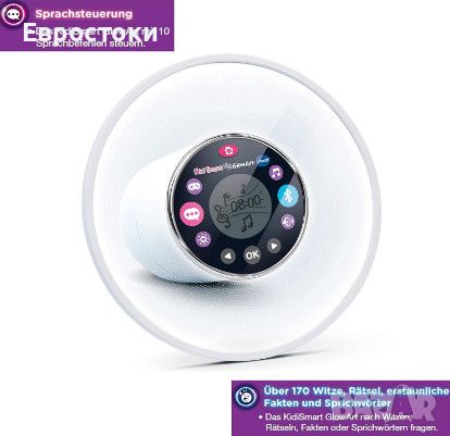 Гласов контрол - разпознават се 10 гласови команди. Това, което прави високоговорителя наистина умен, е способността му да разпознава гласови команди. Децата могат, наред с други неща, да питат за часа и датата, да определят цвета, който свети KidiSmart Glow Art, и да активират шеги или да пускат музика. Всичко това се прави безопасно и без Wi-Fi връзка.