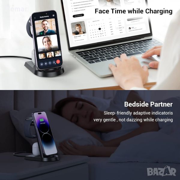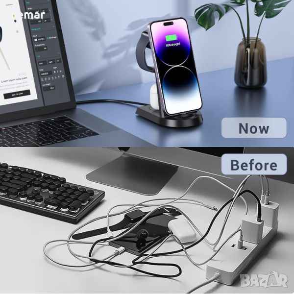 Станцията за зареждане 3 в 1 предлага удобно решение за зареждане на вашия iPhone, Apple Watch и AirPods едновременно само с един кабел, елиминирайки необходимостта от множество зарядни устройства и намалявайки бъркотията. Той разполага с бързо и безопасно зареждане, способно да зареди напълно iPhone и iWatch за приблизително 3 часа и AirPods за 2 часа, използвайки интелигентни технологии за защита като защита от свръхток, свръхнапрежение, защита от презареждане и контрол на температурата. Дизайнът скрива кабелите за подредена настройка и поддържа калъфи на устройства с дебелина до 5 mm, без да е необходимо премахване. Съвместимо с широка гама устройства на Apple, включително различни модели iPhone, Apple Watch и AirPods, това зарядно устройство е идеално както за домашна, така и за офис употреба. Пакетът включва станция за зареждане, кабел Type-C и инструкции.
