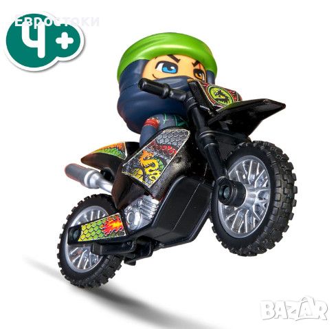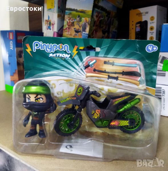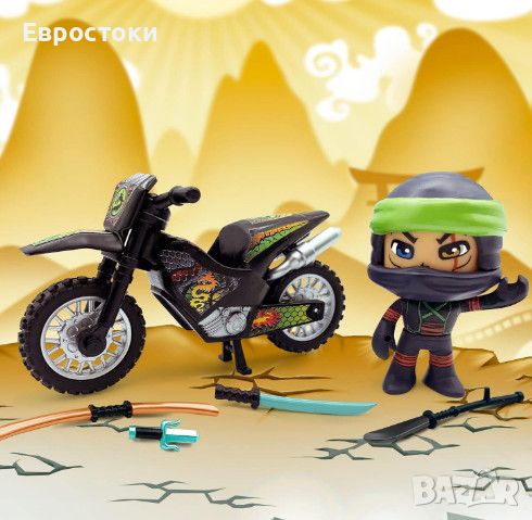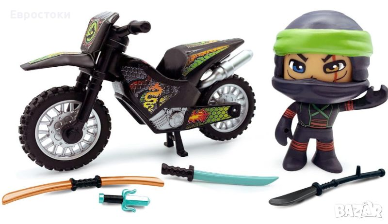 Игрален комплект Pinypon Action - The Ninja motorbike Demon включва мотоциклет Ninja Demon в подходящ дизайн със златен дракон отстрани и зелени акценти. Мотоциклетът има смел, спортен стил с две големи подвижни гуми и основа за хващане, стоене и придвижване.