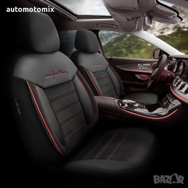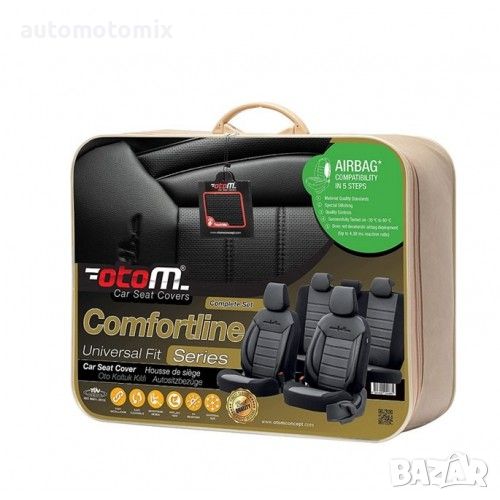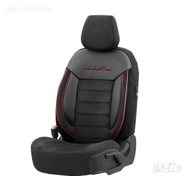 Тапицерия Комфортлайн CMF218 черно/червен кант - 55071 Универсален пълен комплект калъфи за седалки Otom "Comfortline". Изработени от висококачествен велур и кожа. Предпазват от петна, ежедневно износване и запазват оригиналния вид на седалките. Лесни за почистване и поставяне. Подходящ за седалки, оборудвани със странични въздушни възглавници. Цвят: Черно с червен кант Брой парчета: 11 части