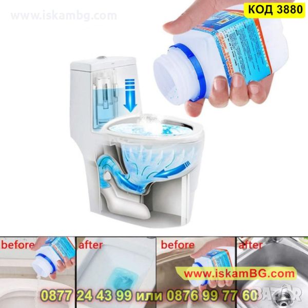 Лесно и бързо отпушване и почистване на запушени канали на мивки, бани, тоалетни и др. Просто изсипете праха в сифона, без да търкате. Използвайки мощно циклонно разпенващо действие, което премахва натрупванията, следите от ръжда и елиминира миризмата и дезодоранта.