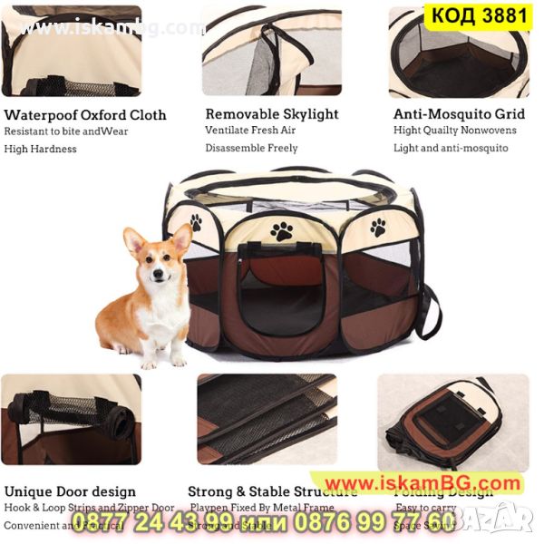 Идеален за повечето домашни любимци, съхраняването им на закрито и на открито, сгъване и нивелиране за лесно съхранение и транспортиране, водоустойчива основа и лесен монтаж.