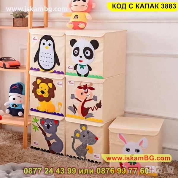 Кутията за играчки, която Ви предлагаме е един чудесен начин, по който ще внесете забавен и свеж мотив в стаята на своето дете! Тя притежава и капак, достатъчно голяма е, за да събере всички любими играчки на детето Ви! Закачлива и интересна за всяко дете, защото има мотиви на различни животни, което със сигурност ще привлече симпатиите на Вашето дете! Лесна е за преместване, можете да я поставите където пожелаете и освен всичко това, тя може да се сгъва, ако не я използвате. По този начин ще спестите място. Закачливата детска кутия е изключително практична. Може да съхранявате в нея, както играчки, така и дрехи. Освен това, кутията за играчки е напълно безопасна за детето Ви водоустойчива, не притежава остри ръбове, а материалът, от който е съставена е мек, от вътрешната страна е подсилена с картон. Позволява пране на ръка.