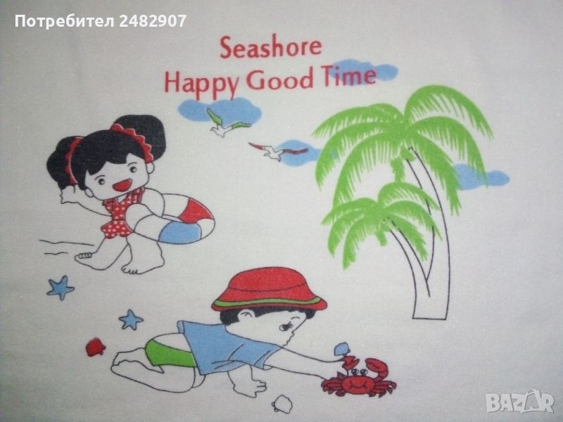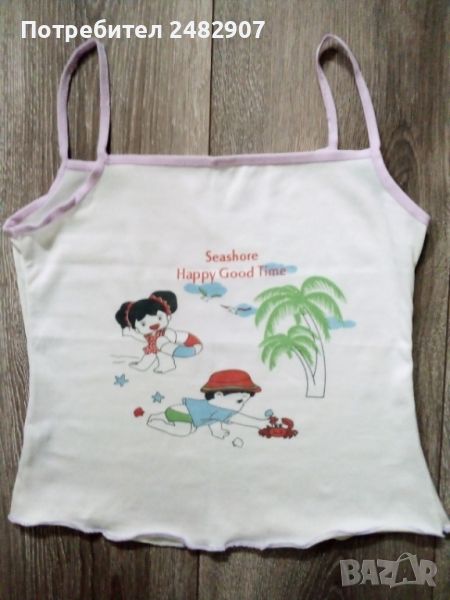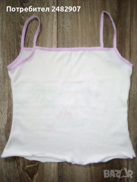 Детски потник за момиче, цвят екрю. Съдържа 88 % полиестер и 12 % ликра. Ширина под мишниците - 34 см, ширина в долната част - 37 см, дължина от горната част на презрамките до долу - 41 см. Запазен, с нормални следи от износване.