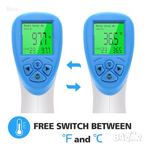 - Това безконтактно измерване означава, че устройството не докосва кожата, предотвратявайки кръстосана инфекция. Лесно е да се използва; натиснете съответните бутони, за да превключвате между режим на измерване, мерна единица и проверка на паметта.