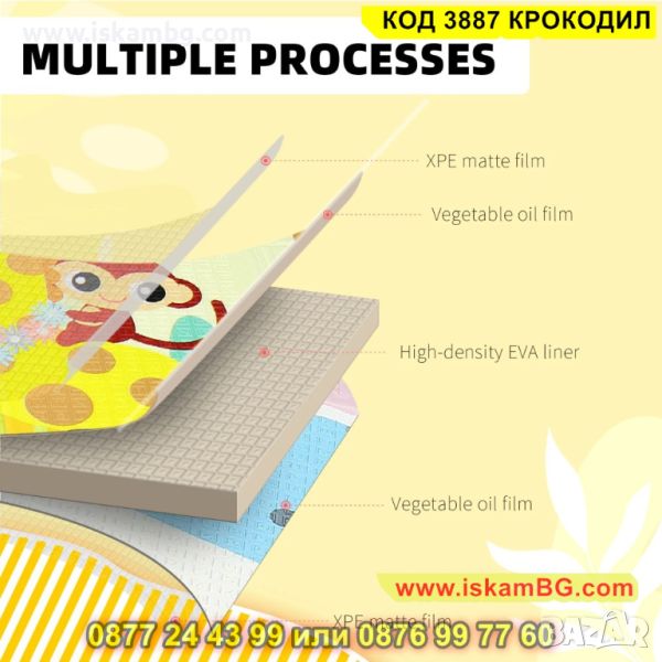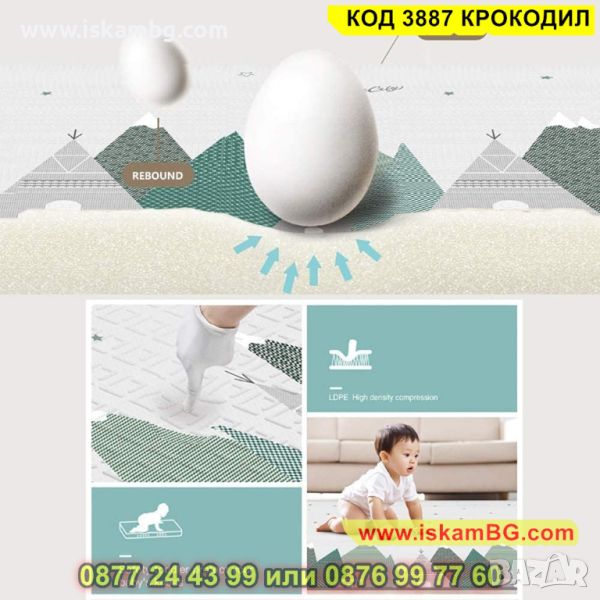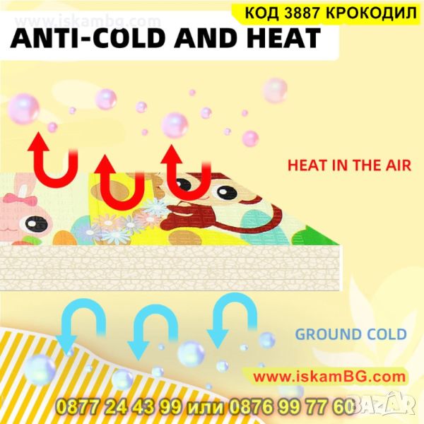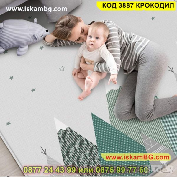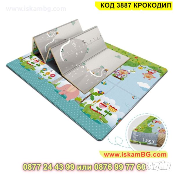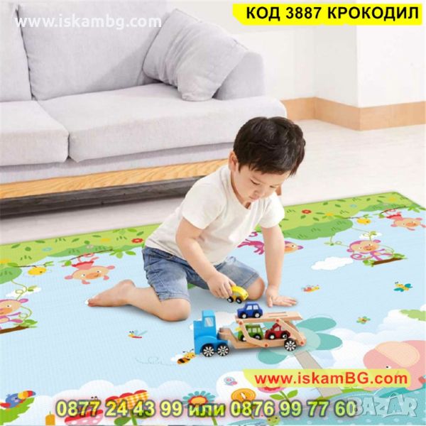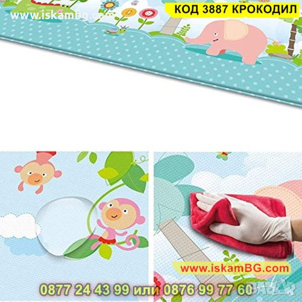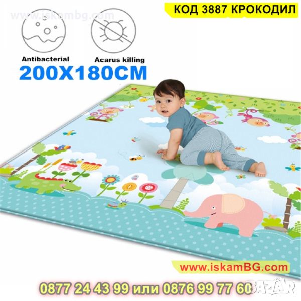Детското килимче е един чудесен аксесоар за всеки дом, където има малко бебе или прохождащо дете! Материалът, от който е съставен е мека и топлоизолационна термо пяна, чиято дебелина е 1 см. С нейна помощ детето Ви няма да почуства студения под у дома! Забавното килимче е с две лица – маймунки и крокодили и ще привлече вниманието на всяко дете. Неплъзгащата подложка пък ще направи детския килим още по надежден в грижата за прохождащото Ви дете. Двулицевият термо килим за деца може да се използва дори и в открити помещения. И това не е всичко! Към комплекта е включена и удобна чанта с дръжки, за да можете лесно и удобно да го транспортирате!