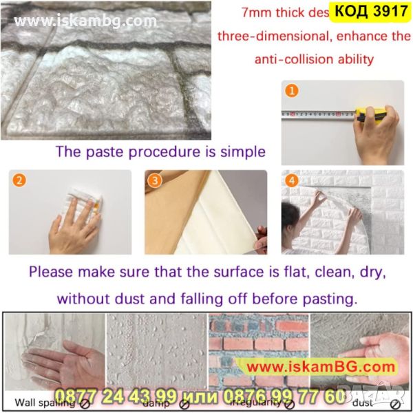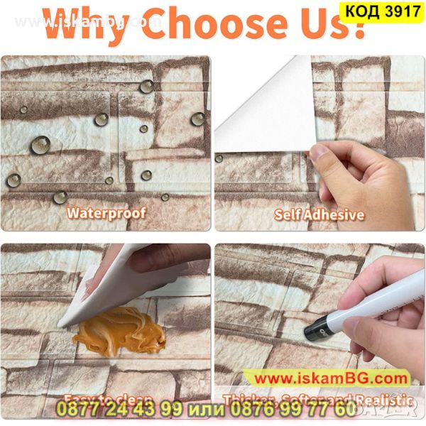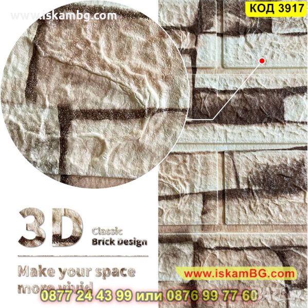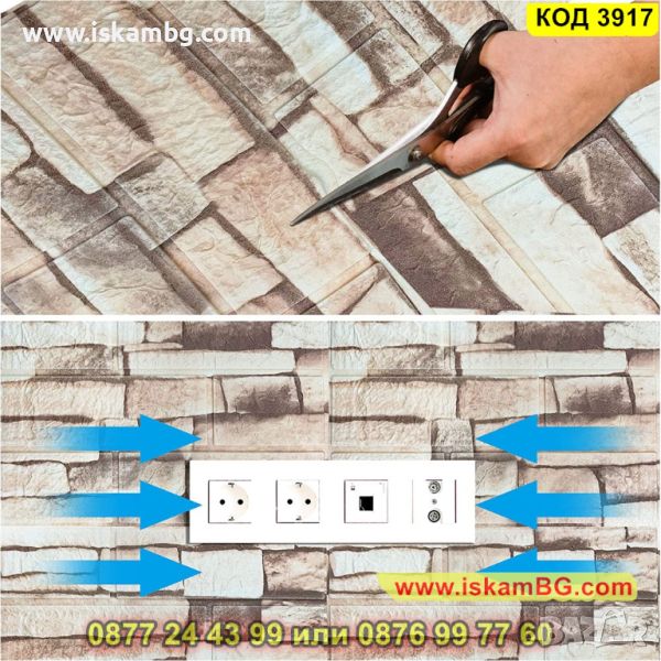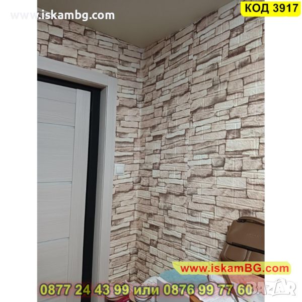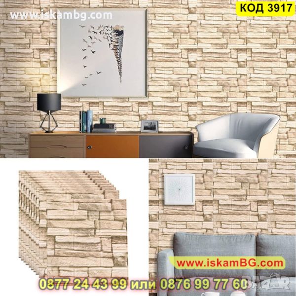 Самозалепващите се 3D тапети, които имитират камък. Съставът им е от екологично чист материал, който има свойства да изолира от звук, температура и вода. Няма мирис, като същевременно с това е мек и гъвкав и издържа на атаки от вредни насекоми. Самозалепващият се тапет, имитиращ камък, е продукт от полиетиленова пяна, която идеално звукоизолира и изолира вода и температура. Той е гъвкав, лек, устойчив на повреди, без мирис. Въпреки че е екологично чист материал , той не е податлив на гъбична активност и е устойчив на атаки от насекоми. Самозалепващият се 3D панел се справя отлично с всички несъвършенствата по стените Ви – вдлъбнатини, влага, остатъци от пробивания и други. Поставя се лесно - трябва да отлепите гърба на тапета и да залепите.
