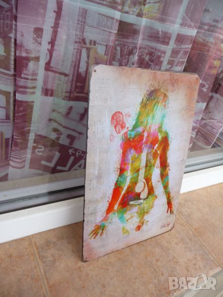Метална ламаринена табела - Момиче с китара и разпуснати коси.