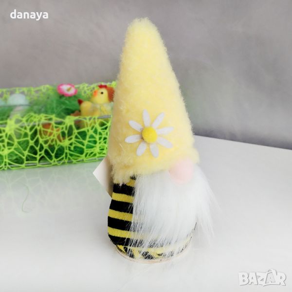 Малка симпатична фигура гномче с дрехи на пчеличка. Шапката му е жълта и има красиво цвете за украса. Чудесно допълнение към празничната великденска украса. Едно поверие гласи, че гномите носят щастие и късмет във всеки дом.
