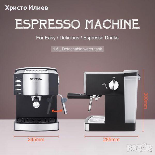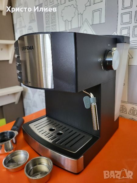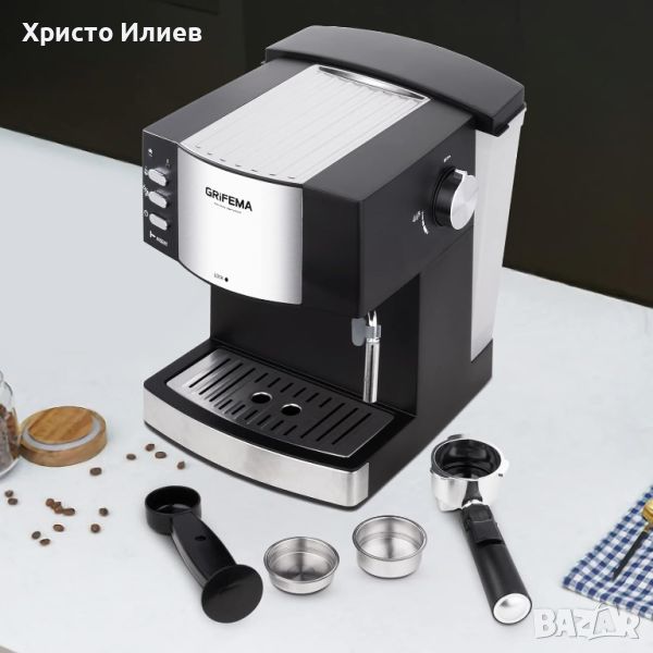 кафемашина за еспресо и капучино от GRIFEMA. 15-20 бара, управляема тръба за пара и тръба за гореща вода за чай. Когато устройството е под свръхналягане или прегряване, налягането се освобождава автоматично, за да се защити устройството. Портафилтър с двоен изход и два филтъра за приготвяне на една или две автоматични кафе сесии. Сваляща се дюза за лесно бързо почистване. Енергоспестяваща функция с автоматично изключване и стендбай.