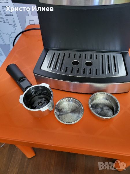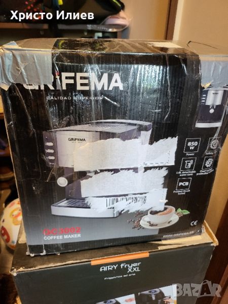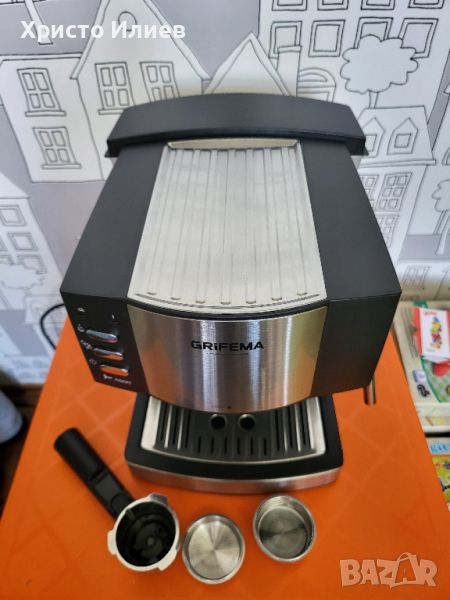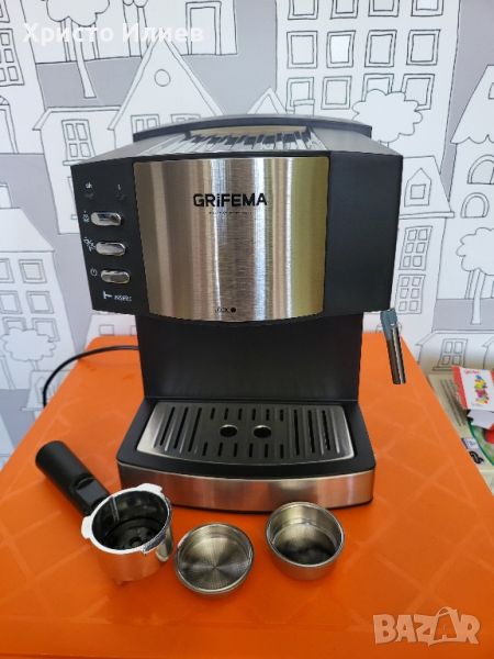 Машината е чисто нова. Има лек транспортен дефект -приложени са реални снимки и може да се види. Поправено е и по никакъв начин не пречи на работата на уреда, В оригинална опаковка.Помпа под налягане: Системата за бързо нагряване и мощната помпа под налягане ForceAroma от 15-20 бара осигуряват най-добрата сметана и максимален аромат във всяко кафе.Висококачествени материали: с двоен изход, многофункционален преносим държач за филтър, професионален държач за портафилтър с алуминиево покритие (за 1 или 2 чаши и ESE Pads).Система за капучино: въртяща се тръба за пара със защита за оптимална млечна пяна за вашето кафе, чучурът може лесно да се отстрани и почисти за последващо почистване.Лесно почистване: Ексклузивен сън за големи чаши (до 10 см височина), подвижна тава за събиране на капките, подвижен прозрачен резервоар за вода с индикатор за ниво на водата за лесно пълнене и почистване.[Нагревател за чаши] Чашата може да се постави или да се загрее предварително преди употреба, което може да удължи времето за съхранение на кафето, когато се поддържа топло.GRIFEMA GC3002 еспресо