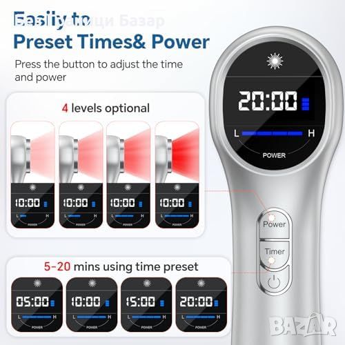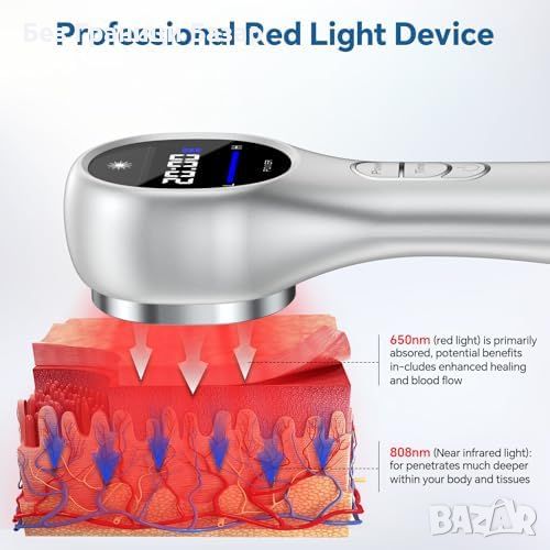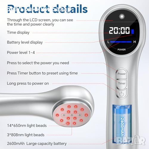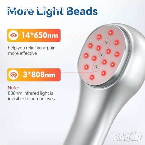 Светодиоди за болкоуспокояване: 14 червени (650nm) и 3 инфрачервени (808nm) светодиода.