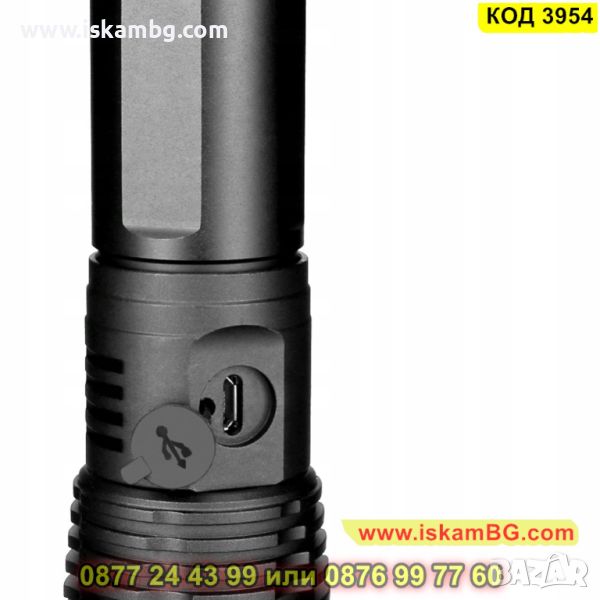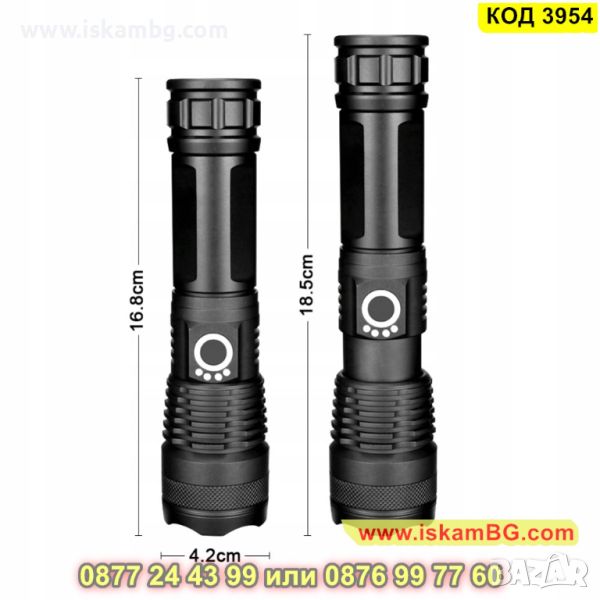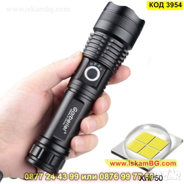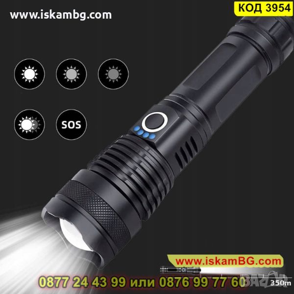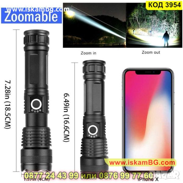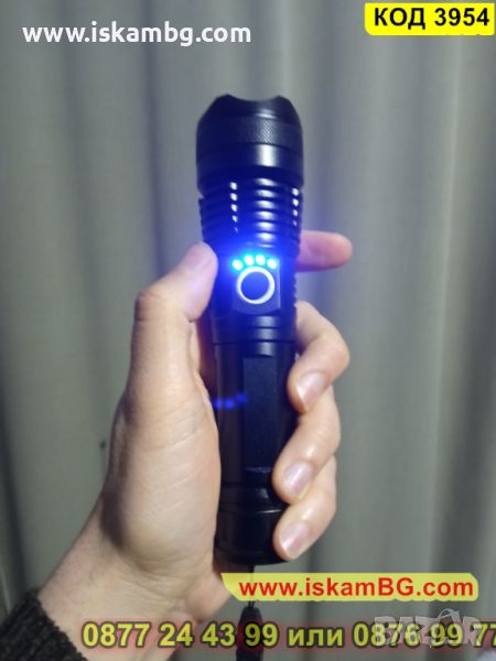 Тактически фенер със zoom 8000 лумена XHP50 е изключително мощен уред. Свети 20 пъти по – ярко от останалите фенери, като може да освети стаи и фокусира обекти на разстояние 350м., ако свети със средна яркост батерията издържа до 12 часа, а презареждането на батерията не влияе на живота й, защото има защита.