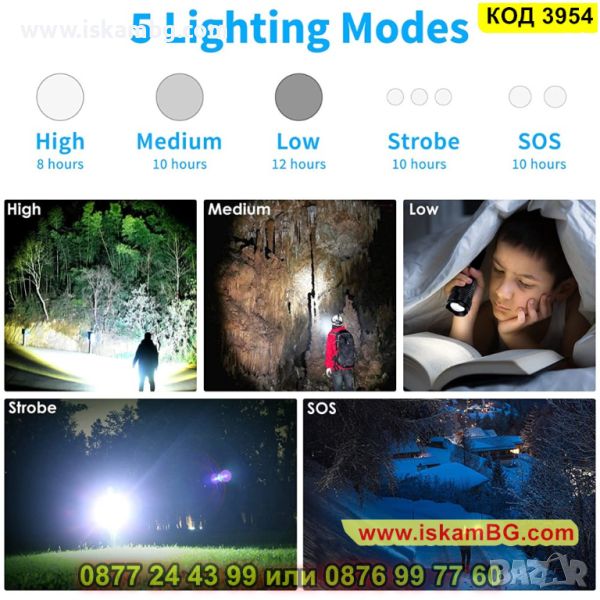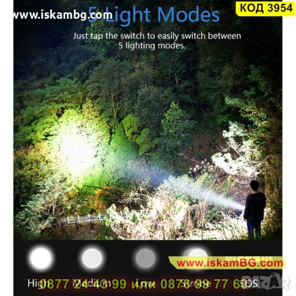 Режими на осветяване: 5 режима, високо, средно, ниско, строб и SOS.