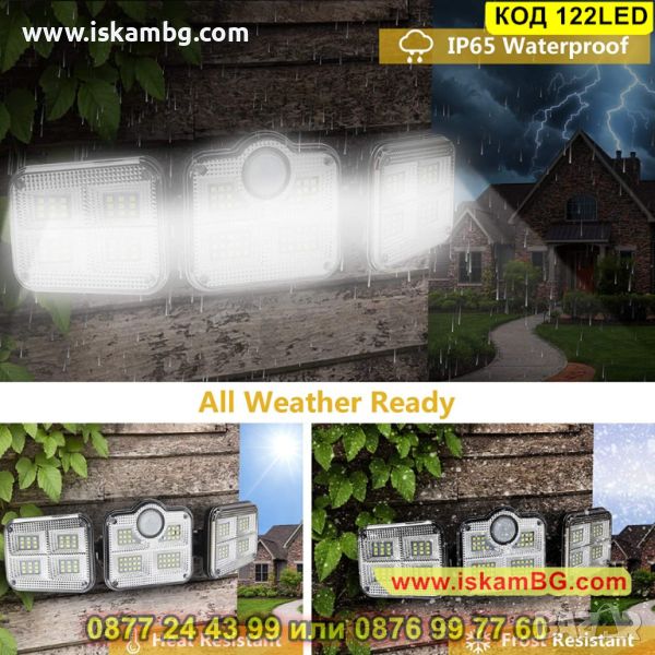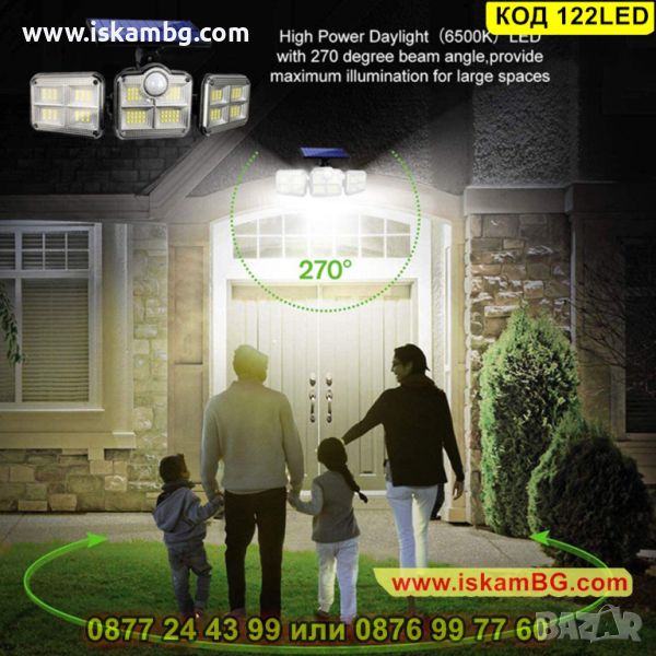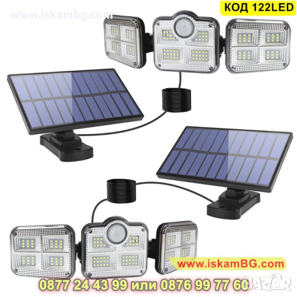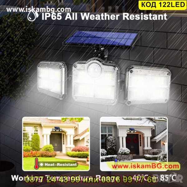 Външна енергонезависима соларна лед лампа, която притежава 122 SMD диода и има сензор за движение, който се активира в радиус от определено разстояние. Също така, изнесеният соларен панел е свързан с външната лампа и зарежда на вградената батерия с помощта на слънчевата енергия, което прави тази лед лампа енергонезависима и енергоспестяваща! Тя издържа на различни атмосферни условия – вятър, дъжд, сняг, благодарение на висококачествени и издръжливи материали, от които е създадена.