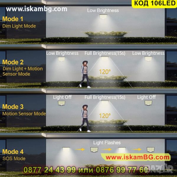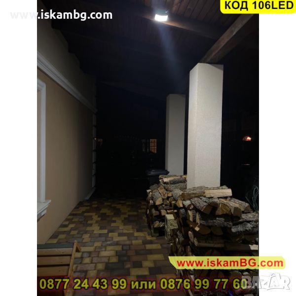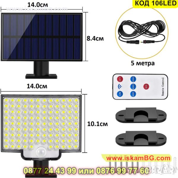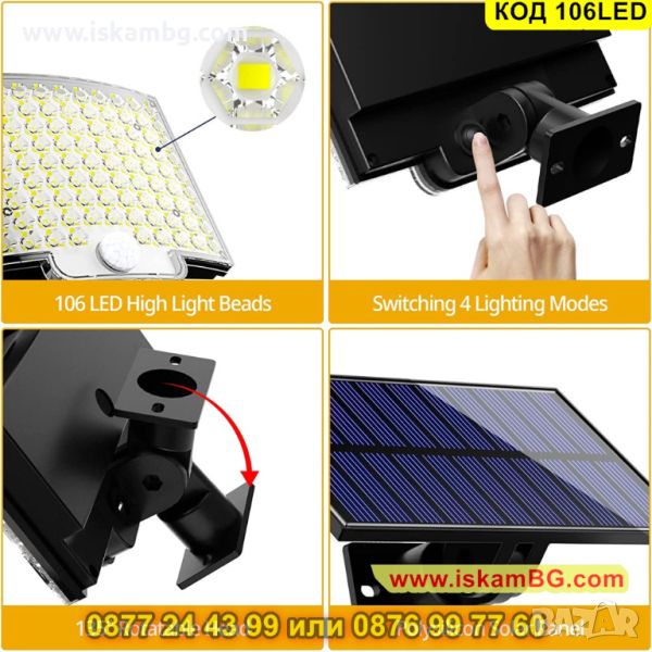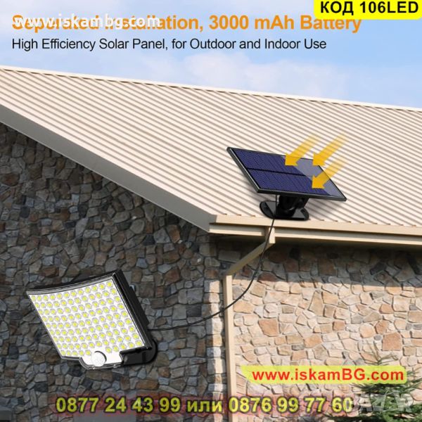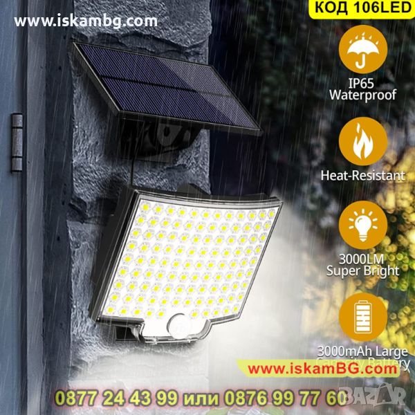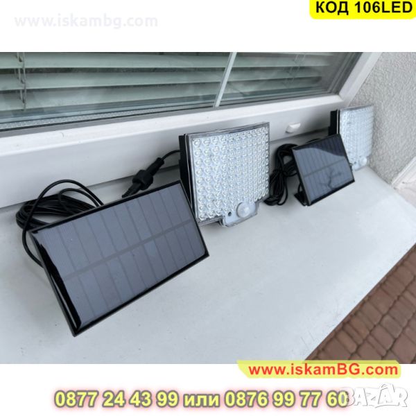 Външна лед соларна лампа, която има 106 диода и свети в ярка светлина подходяща за открити терени. Тази лампа съчетава в себе си висококачествена LED технология със соларна енергия и сензор за движение, като предлага екологичност и практичност. Ниската консумация на енергия прави лампата енергоспестяваща, има дълъг живот. Със своите 106 LED диода, тази соларна лампа ще Ви подари качествено осветяване. Също така, лампата се активира автоматично при засичане на движение в близост от 3-5 метра и така песи енергия. Соларният панел на лед лампата е изнесен и независимост от електрическата мрежа. Панелът събира слънчевата енергия през деня и зарежда вградената батерия, а през нощта лампата се поддържа в работно състояние благодарение на заредената батерия. Подарете си удобство, стил и спестете средства за електричество чрез тази енергоспестяваща и ефективна лед външна лампа, която има 106 LED диода. Подходяща е да се използва за осветяване на градини, входове и всякакви места за опазване на реда и околната среда. Издържа на сняг, вятър и дъжд. Инсталира се лесно и бързо.