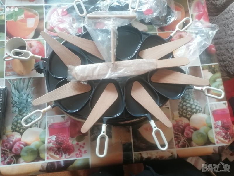 7. Тигани за раклет с топлоизолирана дръжка и цветна точка + още осем броя с кръгла форма