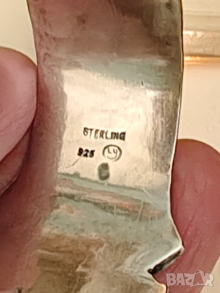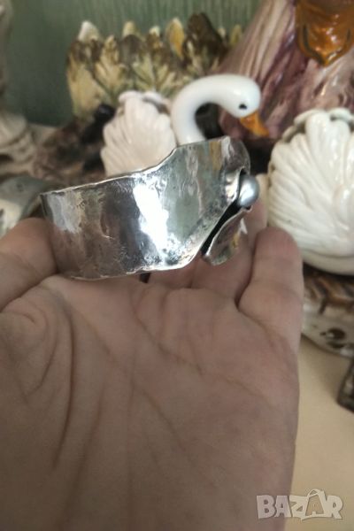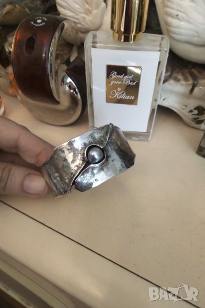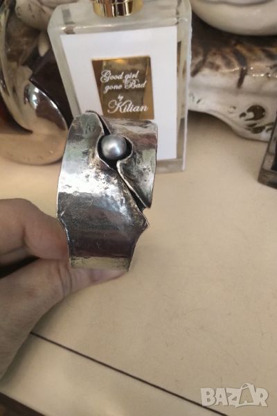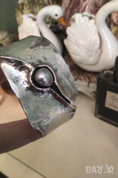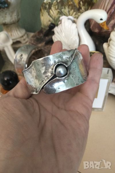 Авторска изработка от ковано сребро 925 и естествена перла американски гривни .Маркирани с няколко маркировки .Размер отворен 6,5 см ширина 3,5 см тежи над 55 грама .Без забележки черното по тях е ефект не дефект .Гривните са две еднакви
