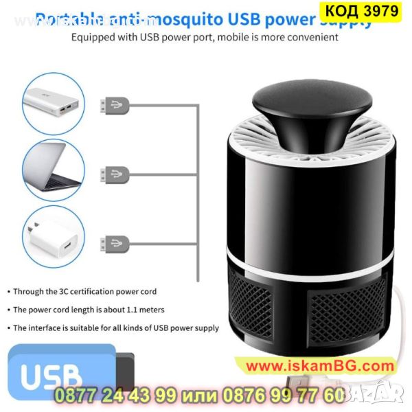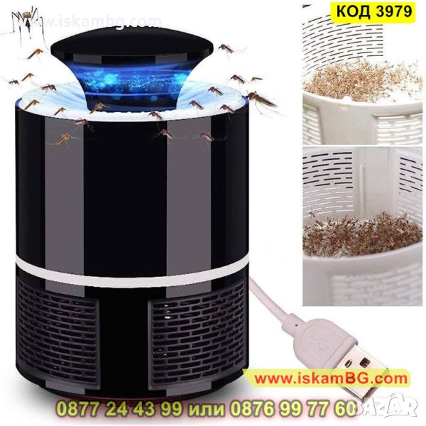 Диазайнът на тази UV лампа против комари и насекоми притежава функция за силно засмукване, когато комарът се приближи до LED лампата. С мощна струя от въздух, комарите биват засмукани и изхвърлени на дъното на уреда. Радиусът на обхват на лампата е 20-30 метра. За да използвате тази практична UV лампа е необходимо да поставите на желаното от Вас място и да я свържете към източник на захранване чрез USB кабела, който е включен в комплекта.