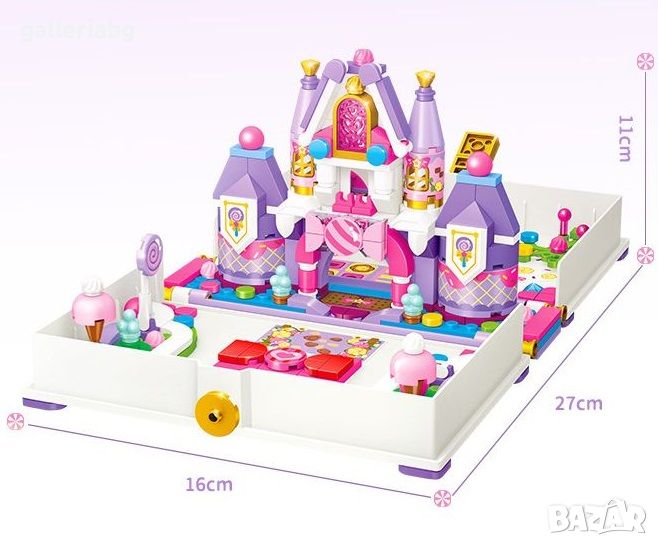 Конструктор бонбонен замък с фигурка тип книга състоящ се от 287 части.