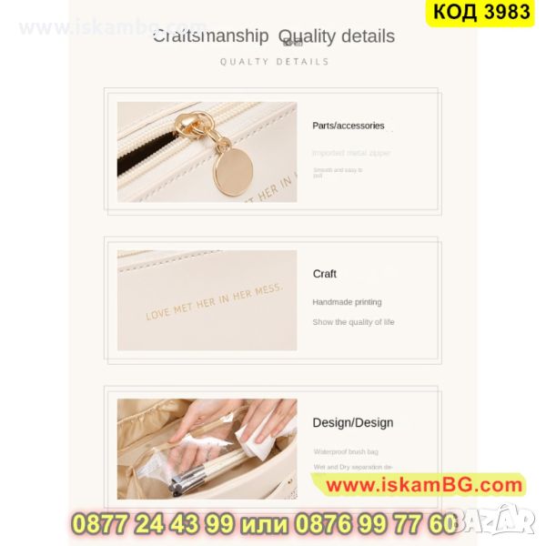 Направена от висококачествени материали. Двуслойна козметична чанта от първокласна PU кожа, лесна за почистване, със специална водоустойчива повърхност, предотвратяваща намокрянето на продуктите.
