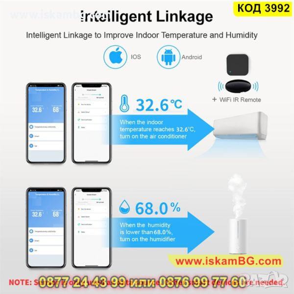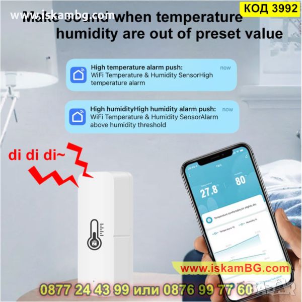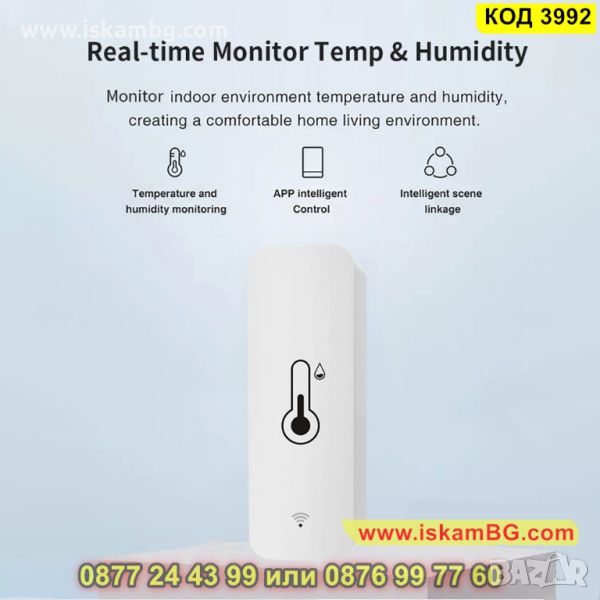 Безжичен Смарт WiFi сензор за измерване на температура и влага, който се управлява от смартфона Ви чрез безплатно приложение, като Tuya или Smart life. Благодарение на това „умно“ устройство Вие ще можете да проверявате параметри у дома или офиса, като влажността и температурата и то от всяка точка по света! Също така, при засичане на условия, които не са обичайни за околната среда, сензорът ще изпрати алармено известие на смартфона Ви или ще изпълни сценарий, който Вие самите сте задали, като да включи климатик или отопление чрез смарт контакт, реле или глава.