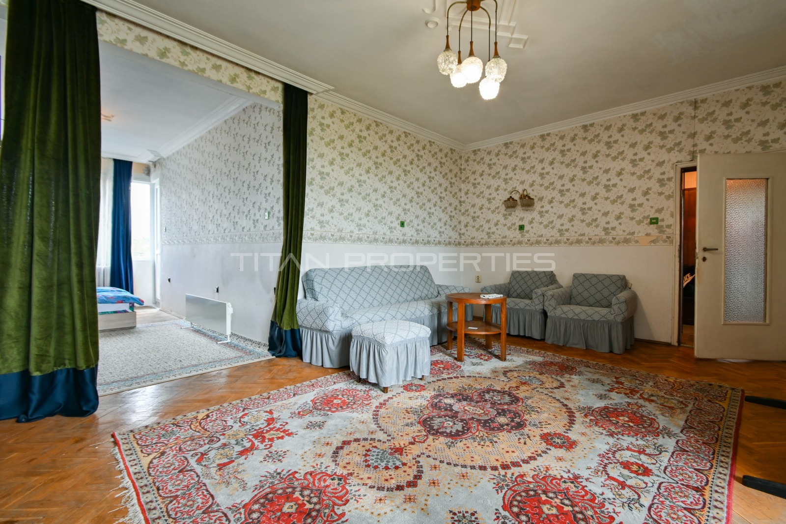 Титан Пропъртис - офис бул.България има удоволствието да ви престави многостаен апартамент , в един от най - предпочитаните райони на град София , а именно район Оборище - комуникативно място , в близост до градски транспорт , училища и детски градини , супермаркети и търговски обекти , медицински центрове и др. В непосредствена близост е и от храм-паметника Александър Невски и парк 'Заимов' Апартаментът е разположен на 5-ти жилищен етаж от шест етажа, със застроена площ от 116 кв.м. Разпределението както следва е : коридор, хол с вестибюл, който може да се прегради и да се използва като спалня, кухня, 2 спални, баня с тоалетна, отделна тоалетна, три тераси. Отопление: ТЕЦ. Изложение: север/юг. Имотът разполага с мазе в размер на 4 кв.м. , таван 30кв.м. и 13% идеални части от земята, която е с площ от 345 кв.м. Жилището се продава полуобзаведено и се нуждае от ремонт, който да го превърне в мечтания за Вас нов ДОМ! За повече информация или оглед на това и други предложения, моля, свържете се с нас на посочения телефон. Реф. номер: 52457