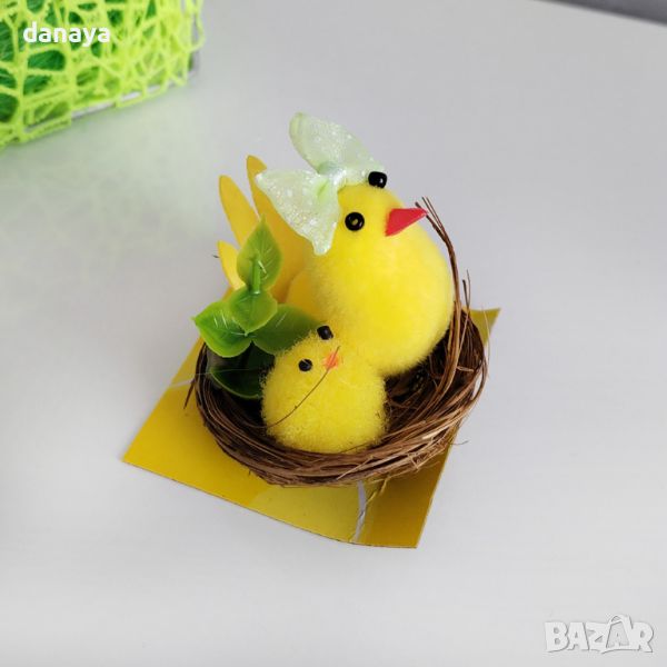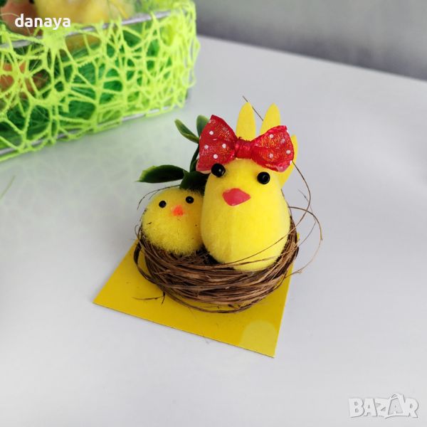 Мини декорация за Великден. Кокошка с пиленце в гнездо. Кокошчиците си имат панделка на главата, за да са красиви за празника. Идеални за украса за светлия празник Великден. Цената е за брой.