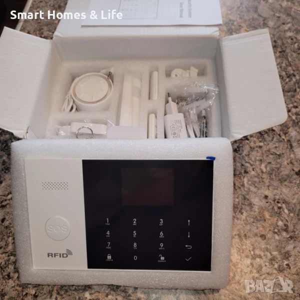 Контролният панел поддържа безжична връзка с обемни сензори за движение, магнитни датчици за врати и прозорци, детектори за дим,