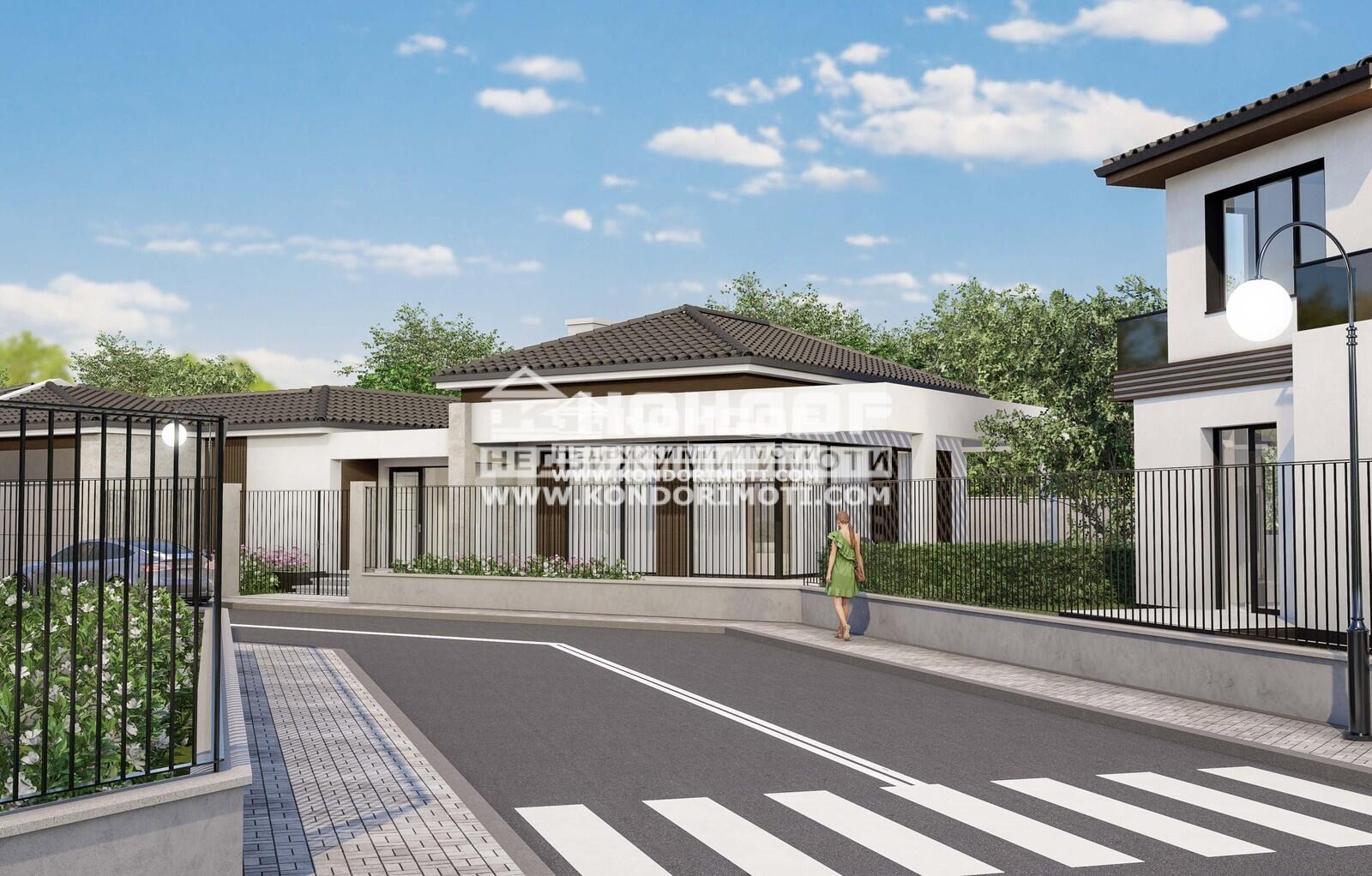 РАЗПРЕДЕЛЕНИЕ: Къщата е Разположена на едно ниво с общо застроена площ от 261кв.м. в самостоятелен двор с площ от 432 кв.м., проектирана с модернистична визия и концепция , залагаща на увеличени светли пространства, високи тавани, френски прозорци създаващи усещане за простор и свобода. Къщите са с достъп от асфалтов път, вързани към Вик с права вода и с канализация !!!