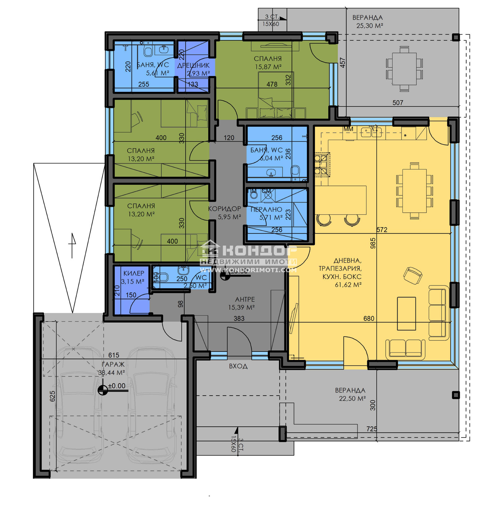 Просторна и функционална югоизточна дневна с площ от 61 кв.м. ще създаде желания комфорт и уют, оформена на кътове: място за Камина, кът за мека мебел с TV секция, трапезарна част и отделен кухненски бокс с излаз на две покрити веранди, съответно с площ от 22.50кв.м. и 25.50кв.м., три спални, като родителската разполага със собствена баня с тоалетна и дрешник, широко входно антре с място за гардеробна, килер, перално помещение, тоалетна с мивка, втора баня с тоалетна, която обслужва двете детски стаи, просторен Гараж с топла връзка към антрето.