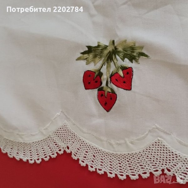Третата с бродираните плодове е в тази обява,но всъщност не зная за какво точно се е използвала,тъй като бродериите и памучната дантела с която е обточена да само от двете страни.Може да е правена за покриване на ракла или някакъв скрин.