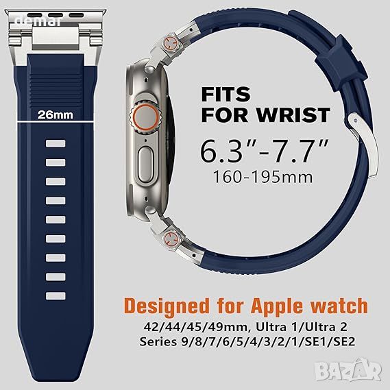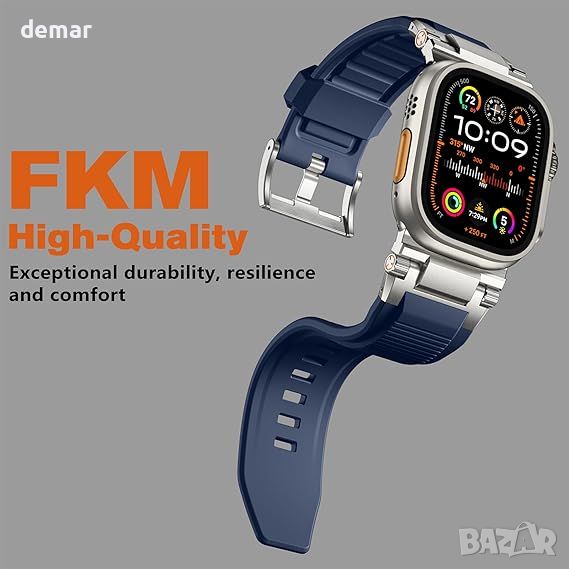 Каишката Bandletic Apple Watch Ultra е изработена от висококачествен FKM флуороеластомер, предлагащ изключителна устойчивост на вода, масло, химикали и топлина, което я прави издръжлива и удобна за ежедневно носене. Неговите полирани метални конектори и обработка с четка на повърхността осигуряват сигурна, стилна връзка с вашия часовник. Каишката разполага с дишащ, устойчив на пот дизайн, който подобрява гъвкавостта и мекотата, съчетан с перфорирано, регулируемо прилягане без инструменти, подходящо за размер на китката 160-195 mm. Освен това комбинацията от устойчив на абразия Viton и здрава неръждаема стомана го прави универсален за различни поводи, удвоявайки се като модерен аксесоар.