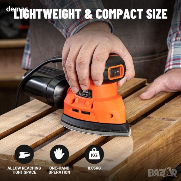 Тази компактна ръчна шлайфмашина разполага с мощен 130 W меден мотор с висока скорост от 12 000 RPM, подходящ за шлайфане на дървени и метални повърхности. Той включва лесна система за закачане и закопчаване за бърза смяна на шкурка, идваща с 12 парчета в две зърнообразности (P80 и P180). Шлайфмашината предлага двойни опции за отстраняване на прах: интегрирана система за събиране на прах с вход за засмукване с 6 отвора и съвместимост с домашни прахосмукачки за по-чиста работна среда. Проектиран за комфорт и контрол, той има ергономична форма с размер на длан с гумена ръкохватка, произвеждаща по-малко шум и вибрации. 3-метровият захранващ кабел подобрява мобилността.