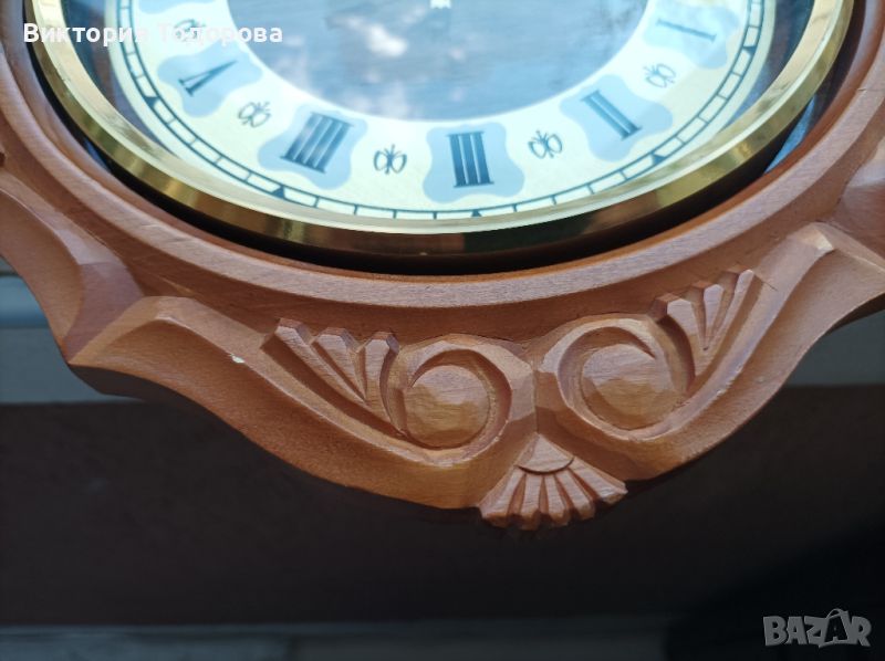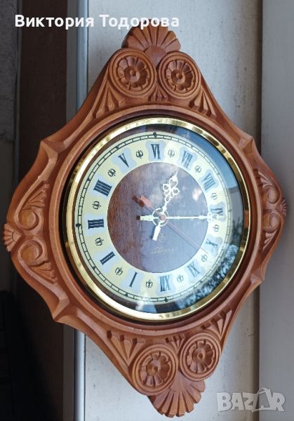 Здравейте! Предлагам работещ стенен часовник Антарес профилактиран от часовникар. Часовникът е е в дървена резбована рамка. На циферблата е наличен знака за качество. Размери 39 х 29,5 см.