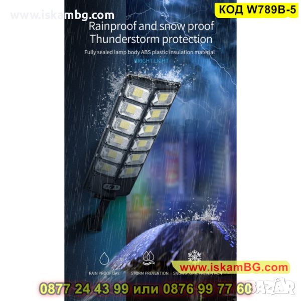 Голямата соларна лампа, която Ви представяме е предназначена да осветява големи терени, дворове или алеи. Притежава соларен панел, който има 420 LED диода и сензор за движение 8 – 10 метра. Също така, нашата соларна лампа разполага с дистанционно управление за регулиране на режима й на работа и яркостта на светене. Мощността на голямата соларна лампа е 210W, а времето й за работа около 12 часа в режим на светене, когато се засече движение. Соларната лампа е с размери - 556 х 165 мм.